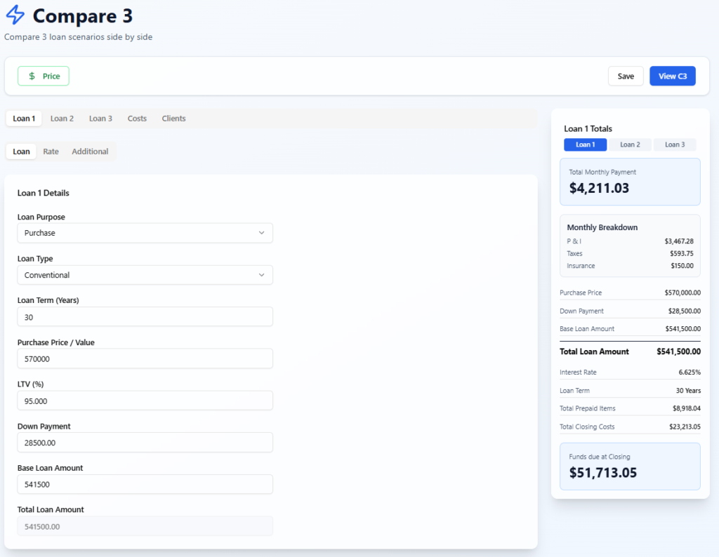 Create and Price 3 loan scenarios at once, all in one place. Show your client the benefits of each scenario. Confidently guide your client to the best option.