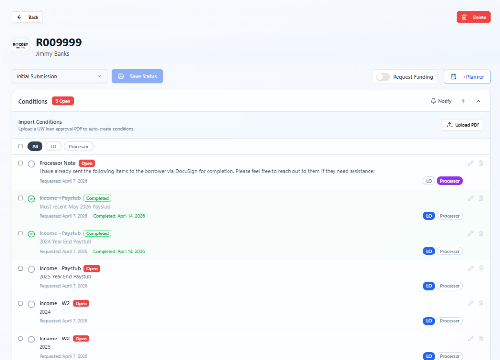 Automated Loan approval reader helps create conditions needs lists for operations, sales and clients. Just drop in your PDF approval and the conditions are generated. Send custom generated needs list emails directly from Pluto.