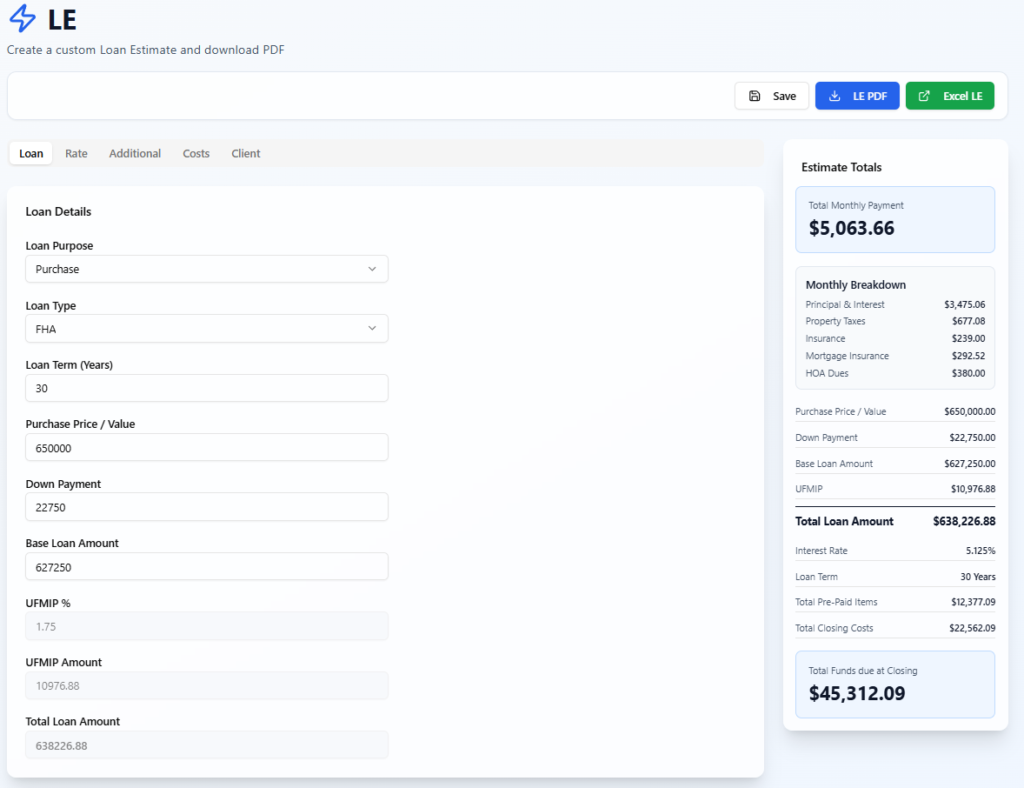 Price your loan scenario and turn then into a custom loan estimate all in one place. Fully customize loan costs, comp and pricing. Print a PDF loan estimate to share with your client or share a link to review the advanced web based loan estimate. The web based estimate helps to explain loan details and terminology.