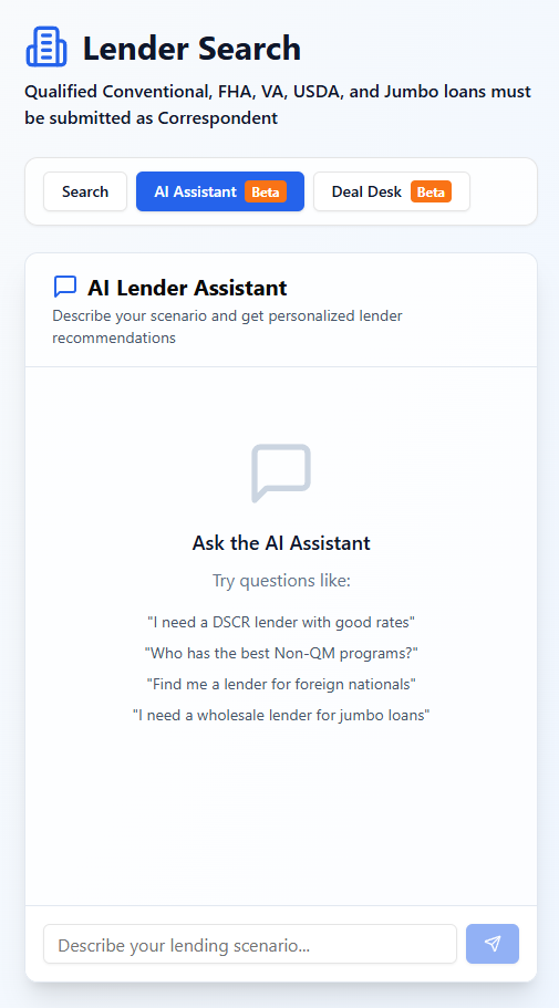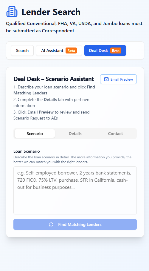 Reach out to multiple AEs with your detailed loan scenario. AI will help you find the right lenders and contact them all at the same time.